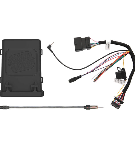 Upgrade your Harley-Davidson motorcycle to a larger aftermarket radio screen and retain the use of the built-in handlebar audio controls using Saddle Tramp’s installation kit. This kit is designed specifically for installing an ISO Double-DIN radio with an “L” shaped chassis design with the chassis at the top. It includes an interface with a water-resistant enclosure that allows the original factory handlebar audio controls, if equipped, to work with the new aftermarket radio. An antenna adapter is also included for a complete installation. (Radio not included). Refer to the vehicle applications tab or chart for more information.