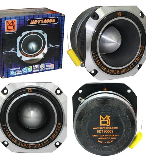MR DJ USA HDT1000S 4-inch Chrome High Compression Titanium Bullet Super Tweeter for Car, Van, ATV, UTV, Marine, Boat, Motorcycle, Motorsports, and Competition MR DJ HDT1000S 4" heavy-duty titanium super tweeters. MR DJ 4-inch square high compression titanium bullet tweeter features flat sides allowing close side-by-side mounting. It has a high-frequency response of up to 20,000 Hz and a sensitivity of 108 dB at 1W/1m. MR DJ Professional grade super tweeters that can easily handle high freque...
