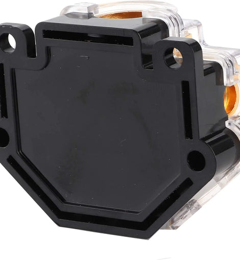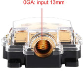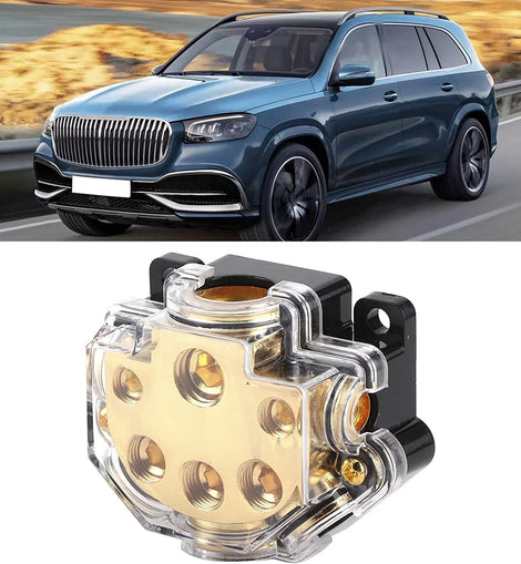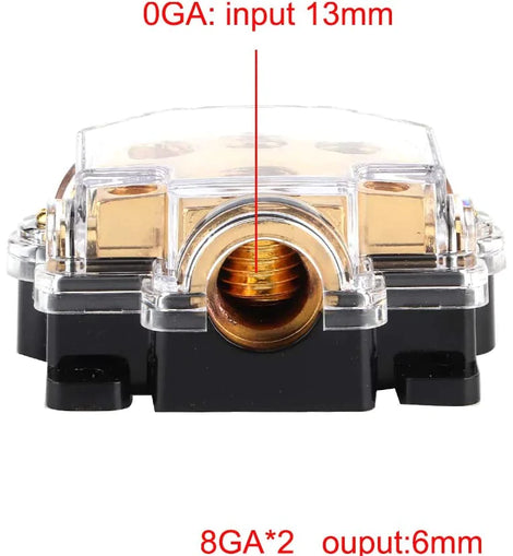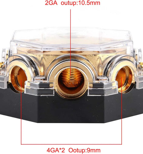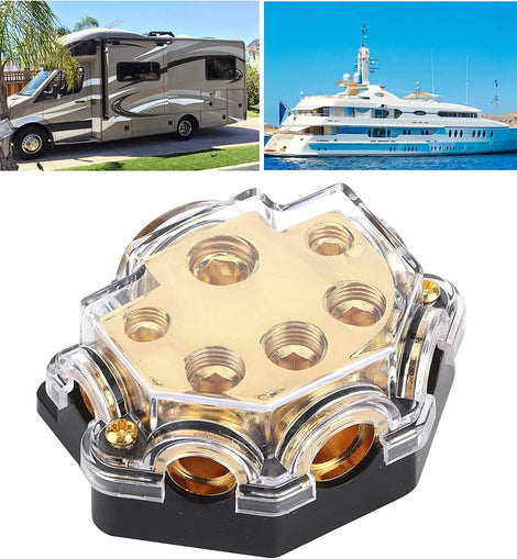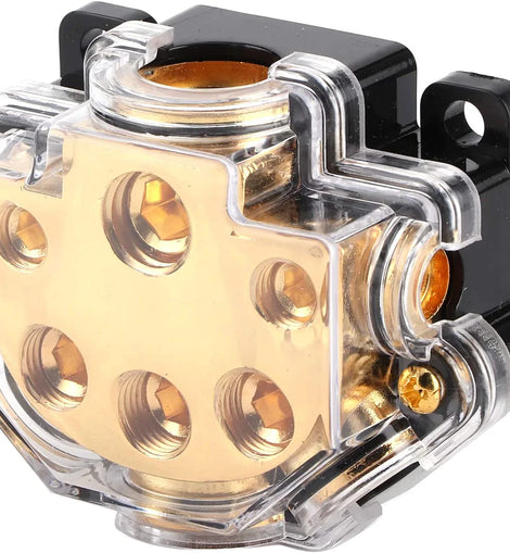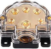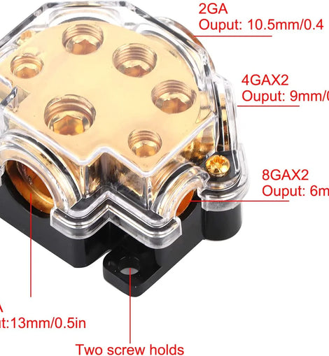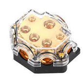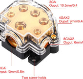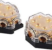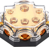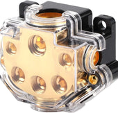 2 Absolute PD-150G 0-2-4 Gauge Gold-Plated 1 in 5 Ways Out Power Splitter Distribution Block with One 0-2-4 Gauge Input, One 2-4 Gauge, Two 4-8 Gauge & Two 8 Gauge outputs