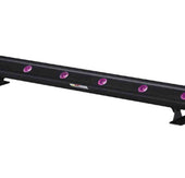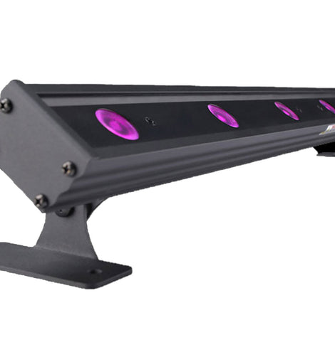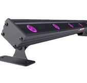 The Antari DFXL510 is an indoor-rated professional high-output UV LED wash strip, well suited for UV reactive material, art, amusement park displays, and signage with bright and vivid colors. The 6 x 1.9W high-power UV LEDs offer a peak wavelength of 365nm and a radiant flux output of 4500mW at full intensity (and minimal visible light). The fixture provides a 25° beam angle and is flicker-free for TV and film production. Special optics prevent wear degradation from high UV exposure. The aluminum extruded housing features two built-in adjustable brackets. A 22 AWG power/data bare-wire-end pigtail cable is attached on the back and connects to the Antari DarkFX Drive 4 fixture driver (sold separately), which is required for power and DMX control.