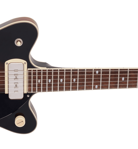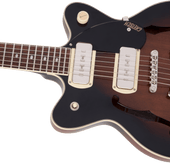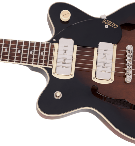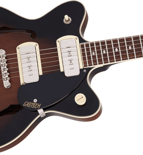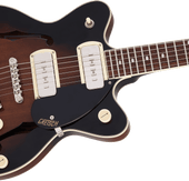 Classic ‘50s and ‘60s Gretsch eye-catching style is also here—all-new “radio arrow” control knobs, enlarged F-holes for increased acoustic projection, stylized pickup bezels, elegant aged white binding with upgraded purfling, one-ply black pickguard, slick-looking nickel hardware and standout finishes including Brownstone and Claret Burst. Easy to play while rocking out thanks to its smaller 14” body, the G2655-P90 is a phenomenal instrument for the modern musician who wants to control the stage and the audience while standing out from the pack.