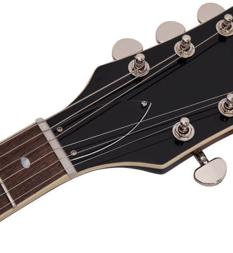 The Streamliner’s sonic power is harnessed and shaped by the traditional control layout—neck and bridge pickup volume controls, a master tone control, master volume control and three-way pickup switching. The V-Stoptail can withstand the heavier styles of playing, while the anchored Adjusto-Matic™ bridge and synthetic bone nut grant astounding tuning stability and accurate, slip-free intonation.