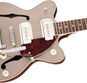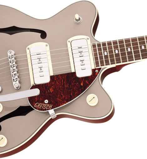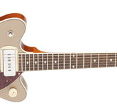Classic ‘50s and ‘60s Gretsch eye-catching style is also here—all-new “radio arrow” control knobs, enlarged F-holes for increased acoustic projection, stylized pickup bezels, elegant aged white binding with upgraded purfling, one-ply tortoise pickguard, slick-looking nickel hardware and standout finishes including Two-Tone Midnight Sapphire and Vintage Mahogany Stain, Two-Tone Mint Metallic and Vintage Mahogany Stain or Two-Tone Sahara Metallic and Vintage Mahogany Stain. Easy to play while rocking out thanks to its smaller 14” body, the G2655T-P90 is a phenomenal instrument for the modern musician who wants to control the stage and the audience while standing out from the pack.
