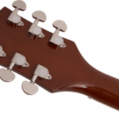 • Slightly smaller 14” double-cutaway arched mahogany body with chambered spruce center block