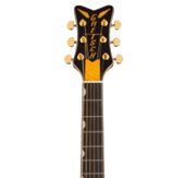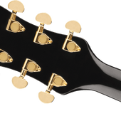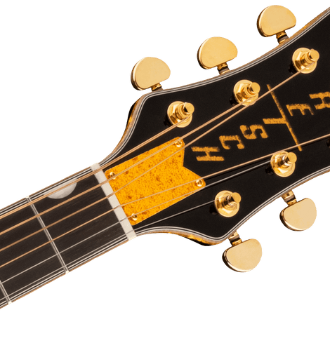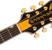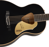 The Fishman® Presys III pickup/preamp system provides a modern sonic complement to classic touches including a solid spruce top with maple back and sides, mahogany neck, 12”-radius laurel fingerboard with 20 vintage-style frets, pearloid Neo-Classic™ thumbnail inlays and synthetic bone nut, laurel bridge, gold sparkle binding and vertical wing” Gretsch headstock logo, gold plexi pickguard, gold hardware, and more.
