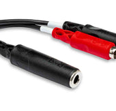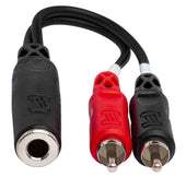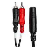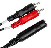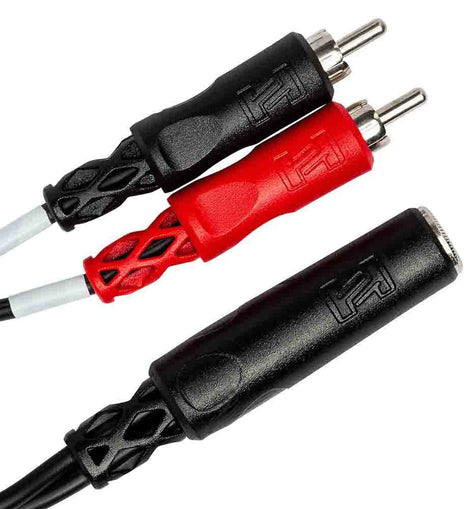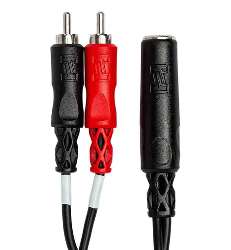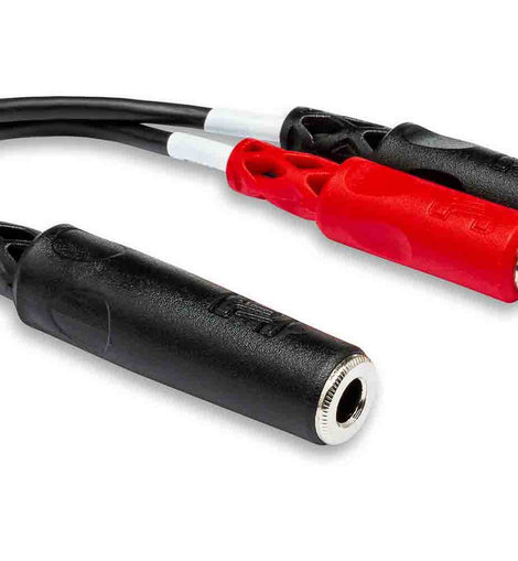 The Hosa YPR-257 cable is designed to split a stereo signal. Black- and red-coded phono jacks indicate left and right respectively. It may be used to adapt a stereo cable with phono plugs to a stereo phone jack.