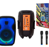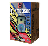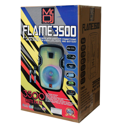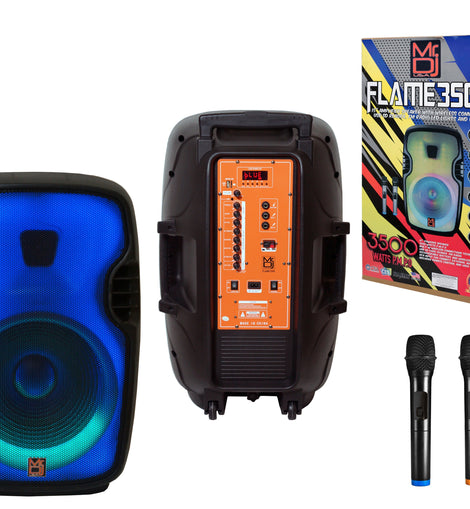 MR DJ FLAME3500LED Professional Rechargeable Portable Trolley 15” 2-Way Full-Range Powered/Active DJ PA Multipurpose Live Sound Bluetooth Loudspeaker with Full Fire Flame Glow Disco Lights and Two Wireless Microphone with Speaker Stand