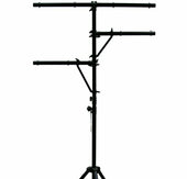 A low-cost solution for DJ lighting stands, the Mr. DJ LS-360 lighting stand enables quick and easy setup of your lighting fixtures on any stage or set. Its black metal finish looks phenomenal and blends in on most stages. Use only for static lights. This classic stand allows maximum height adjustments and supports up to 8 par cans. The stand telescopes with friction adjustment knobs and locking pins provide added security. The top T-bar holds up to 4 par cans, while the side mount bars will hold four additional par cans.