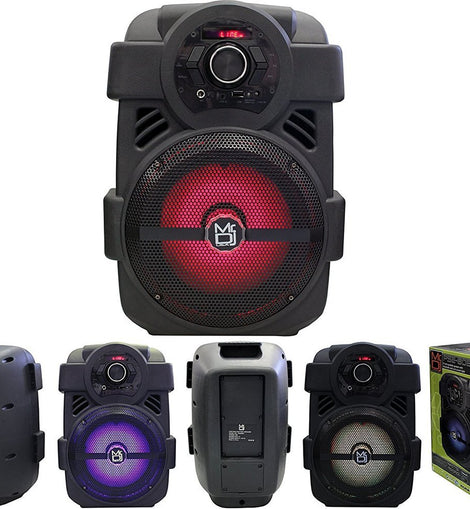8” Portable Active Speaker with Rechargeable Battery 1200 Watts P.M.P.O, Built-in Bluetooth Technology, It Can Stream Music from Bluetooth-enabled Devices, and Through USB, or Can be Connected with a Cable Through the Aux-in Port., USB Card Reader, FM Radio, RGB Party LED Lights, Microphone In 1/4” Jack, AUX In for Allows you to Connect an External Audio Device, Mode Accent Lighting, LED Screen Display and Metal Grill-Covered Speakers and Equipped with a Handle and Wheels for Easy Transportation. The Speaker Also has a Microphone Input for Karaoke. The Rechargeable Battery Lasts For Hours so You Can Stream Music Even in Places Without an Outlet Nearby.