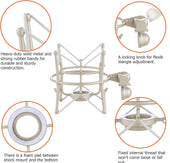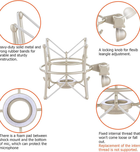 MR DJ USA SP01-S Universal 22mm (0.87") Microphone holder is designed for mounting recording condenser microphones to effectively isolate or reduce the physical vibration, floor, and stand noise. It is ideal for recording and podcasting, making the recording effect more appropriate and giving a better experience. This shock mount mic holder can isolate condenser mics from most physical vibrations and floor and stand noises. And it’s ideal for recording, podcasting, broadcasting and more. It will make your broadcast or singing voice sound better. The shock mount was made of heavy-duty solid metal, except for the elastic band and pad. It also came with mounting pads to protect the bottom of the mic. Features an angle adjustable locking knob with a 5/8 inch screw hole, which can be easily attached to any universal mic boom arm or stand.