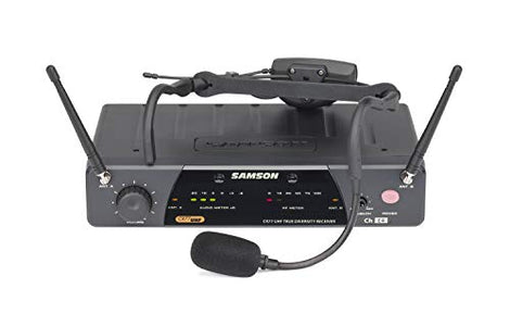 Samson AirLine 77 AH7 Fitness Headset system is a wireless microphone solution designed to meet the specific demands of fitness instructors and active performers. With the unique AH7 micro transmitter mounted to a sweat-resistant Qe fitness headset microphone, you can free yourself completely from cables and belt packs, ideal for aerobics, yoga, spin, Zumba, boot camp, boxing, and kickboxing classes for a truly exhilarating and motivating experience. This allows you to focus on your class or performance and not worry about your audio. The AH7 micro transmitter is mounted directly on the headset. This is unique compared to traditional wireless systems that typically use a belt pack with a wire running from the microphone to the transmitter. The transmitter operates for up to eight hours on a single AAA battery. The Samson Qe condenser microphone, whose sweat-resistant capsule prevents corrosion from moisture and sweat. The bidirectional pickup pattern reduces background noise, minimizes feedback problems, and effectively rejects signals not originating directly in front of the mic capsule. The CR77 True Diversity receiver provides reliable performance with up to 300' (90m) wireless operation. The rear panel features balanced XLR and unbalanced 1/4 outputs, allowing it to integrate into any audio system easily. Its half-rack housing is light enough to throw in your bag or permanently installed with a rackmount kit (sold separately).