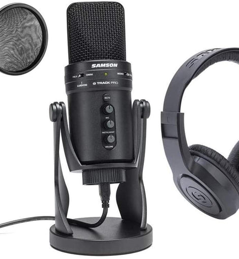Samson G-Track Pro Studio USB Condenser Mic with Audio Interface - Bundle With Samson SR350 Over-Ear Stereo Headphones, Mr Dj Pop Filter with Gooseneck