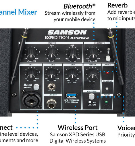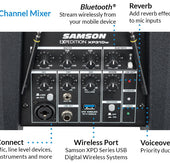 • USB wireless port accommodates Samson XPD Series USB Digital Wireless Systems and phone charging